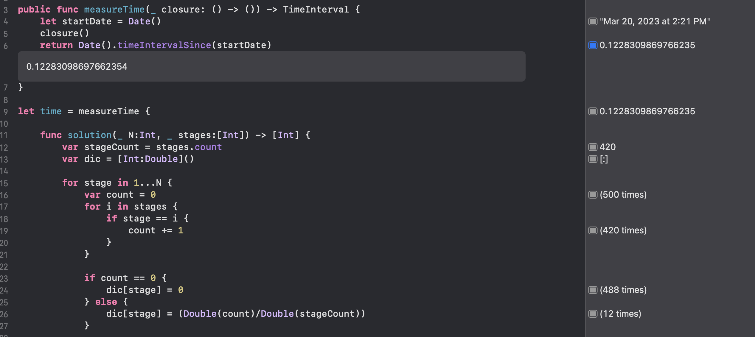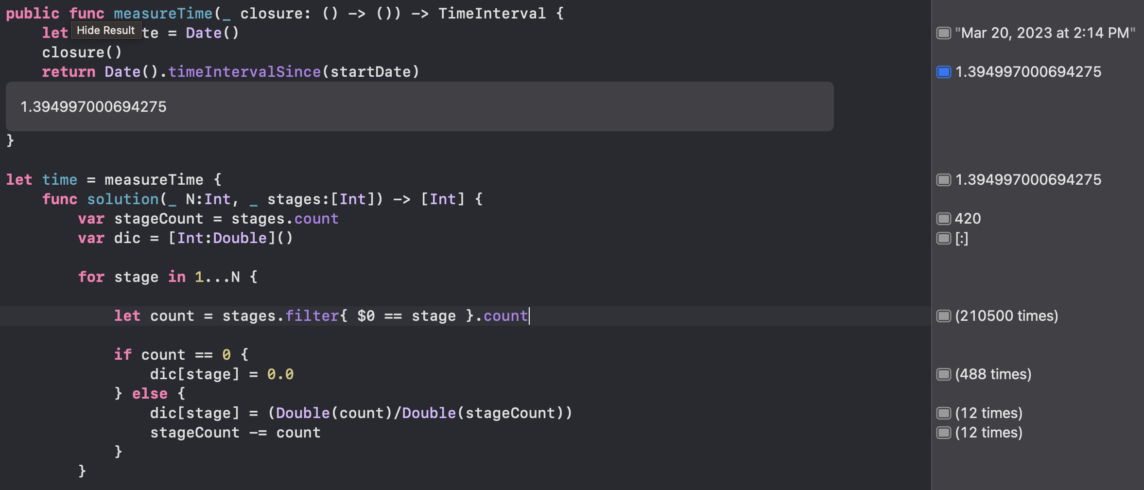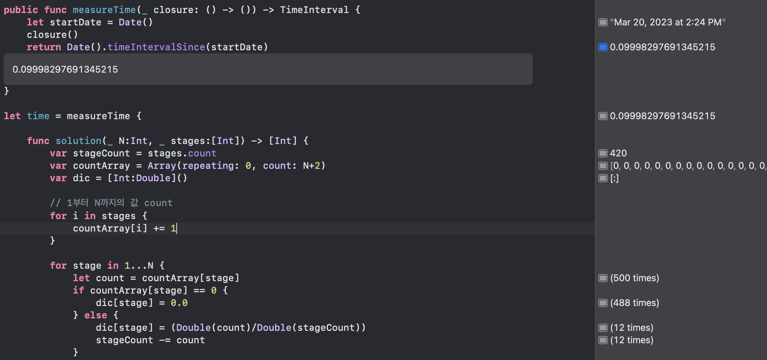 하지만 N으로 주어지는 범위가 1 이상 500이고, stages의 범위가 1부터 200,000이기 때문에, 이중 for문 코드를 작성시 testCase의 값이 많아질 때 시간 초과가 발생하게 됩니다.