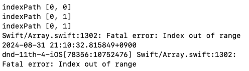 첫 클릭시에는 indexPath의 값이 잘 전잘되지만, 두 번째 클릭부터는 [0, 1]의 값이 중복으로 두 번씩 전달되면서 배열의 index에 접근하여 remove 해 주고 있는 코드에서 index out of range error가 발생하게 되었습니다.