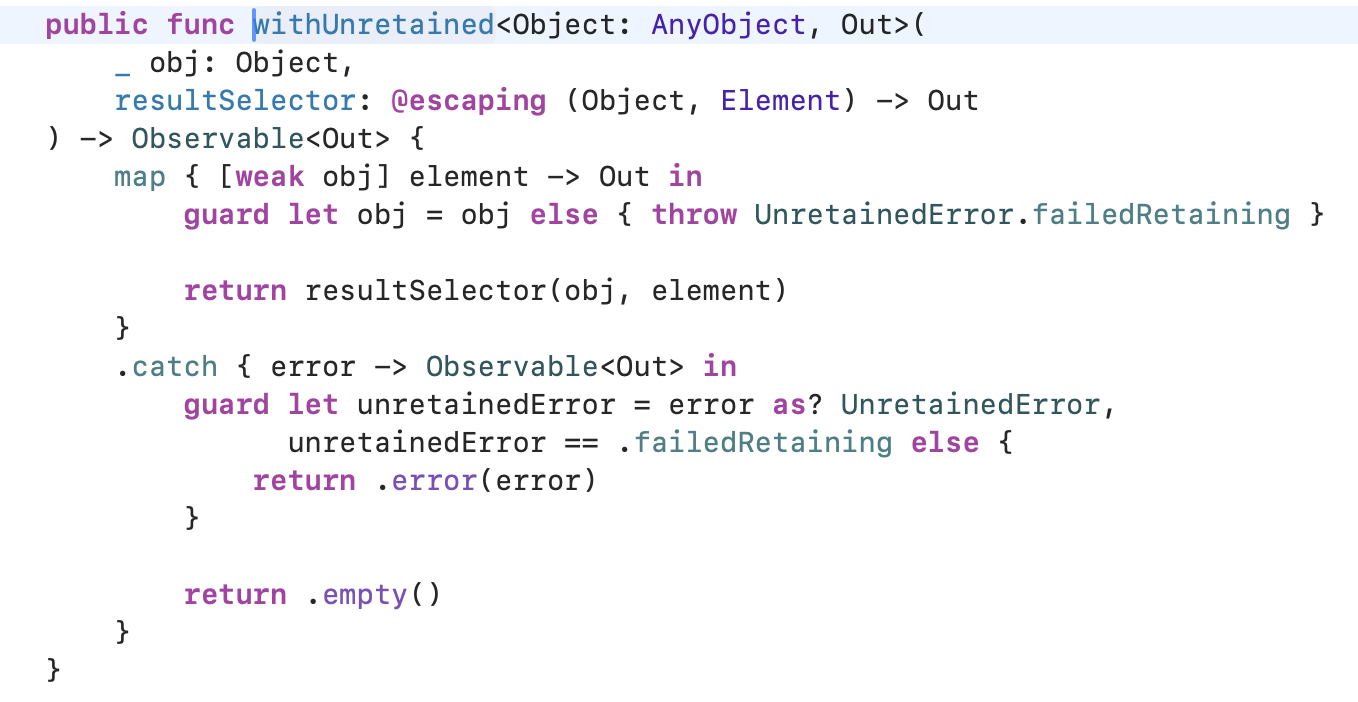 만약 withUnretained를 사용하는 스트림이 share(replay:1)을 사용 중이라면 replay buffer가 self와 함께 값을 버퍼링하여 특정 상황에서 순환 참조를 발생시킬 수 있습니다.