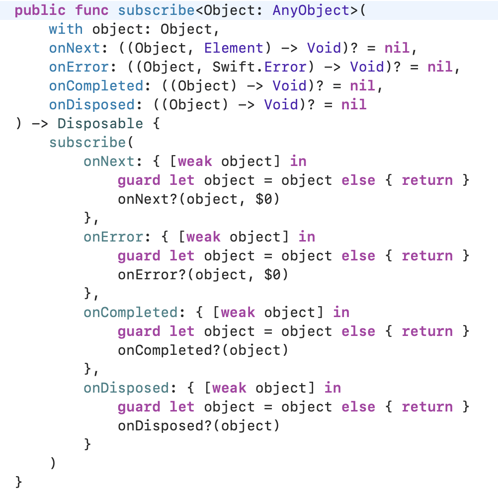 그래서 RxSwift 6.1부터 withUnretained 대신 subscribe(with:onNext:onError:onCompleted:onDisposed:)를 추가했습니다.